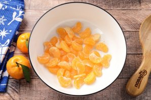 Очистите мандарины, разделите на дольки и переложите в глубокую миску. Если у вас крупные мандарины, нарежьте дольки на 2-3 части.