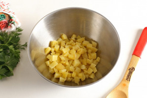 Картофель очистите, нарежьте мелкими кубиками и сложите в глубокую миску.