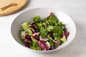 Салатный микс промойте и обсушите, переложите в глубокую миску.