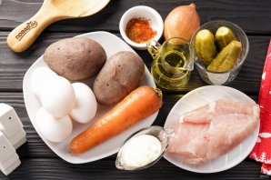 Подготовьте все ингредиенты по списку. Картофель, морковь и яйца отварите заранее и дайте остыть.