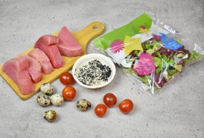 Готовим теплый салат с тунцом. Стейк из тунца сделаем в панировке из кунжута и нарежем тонкими ломтиками. Получается очень вкусное и легкое блюда для обеда, ужина или праздничного стола.
