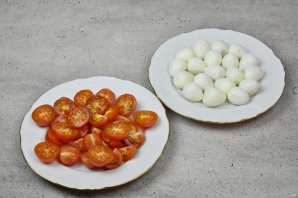 Перепелиные яйца выложите в холодную воду, доведите до кипения и варите в течение 4 минут на среднем огне. Сразу после варки переложите яйца в миску с холодной водой, чтобы остановить процесс приготовления и облегчить чистку яиц от скорлупы. Очищенные яйца разрежьте пополам. Помидоры черри помойте, просушите и тоже разрежьте пополам. Если помидоры крупные можно разрезать их на четвертинки.